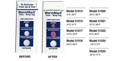 溫度指標(biāo)標(biāo)簽是體積小、成本低的溫度指示標(biāo)簽或時(shí)間/溫度標(biāo)簽,,使用于食品運(yùn)輸、儲(chǔ)存或處理過程。典型的用途包括監(jiān)測藥品、化學(xué)品和新鮮農(nóng)產(chǎn)品在運(yùn)輸過程中德溫度。如果溫度超出預(yù)設(shè)的限制之外,,標(biāo)簽顯示變色。 DeltaTrak提供滿足你各種需要的標(biāo)簽:WarmMark溫度標(biāo)簽、高溫?zé)針?biāo)簽和TempDot時(shí)間溫度指示標(biāo)簽顯示溫度變 化超過預(yù)設(shè)的時(shí)間。FreezeCheck和ColdMark溫度標(biāo)簽用于顯示運(yùn)輸溫度低于0℃。商業(yè)洗碗機(jī)使用的TempDot高溫?zé)針?biāo)簽可顯示最終沖 洗水溫是否達(dá)到71℃(HACCP體系所要求的溫度)。 WarmMark 溫度標(biāo)簽,,型號51013-51035,, 監(jiān)控產(chǎn)品在運(yùn)輸、 儲(chǔ)存或處理過程中的溫度。反應(yīng)溫度范圍可從-18℃至37℃。這些不干膠標(biāo)簽直接適用于產(chǎn)品、包裝、紙箱或大包裝上。一旦反應(yīng)溫度達(dá)到或超過,,標(biāo)簽便被激 活而發(fā)生不可逆變色。紅色顯示溫度的閾值外暴露經(jīng)過了一個(gè)短暫,,中等或長久的時(shí)間段。你一眼便能看出是否有溫度閾值外暴露發(fā)生,,提供質(zhì)量保證的永久記錄。
